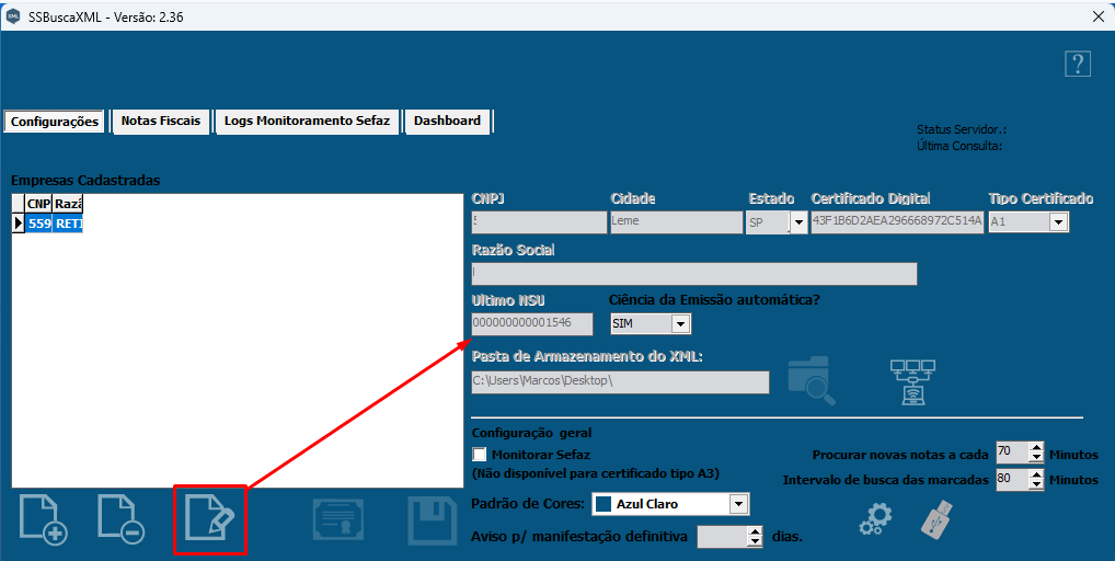 Acesse a aba Configurações, faça a edição das informações e no campo NSU altere para 0.
