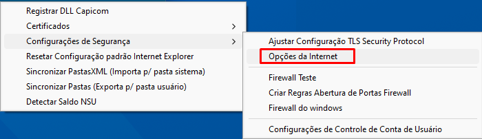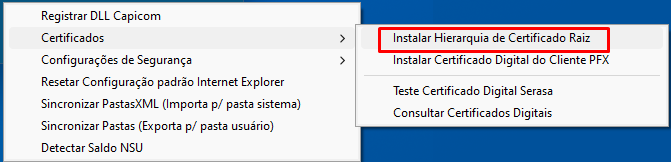 4) Selecione Certificados>Instalar Hierarquia de Certificado Raiz, será apresentada uma tela na cor Preta
