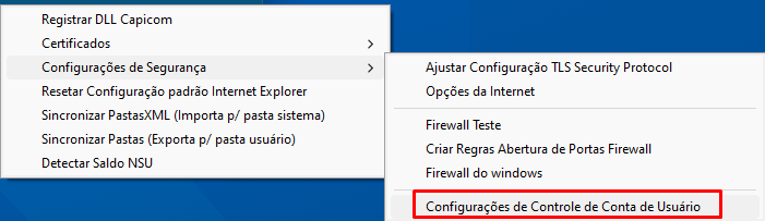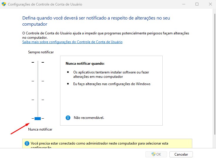 11) Selecione a opção Configurações de Segurança>Configuração do Controle de Contas do Usuário e Ajuste para o Nível mais baixo