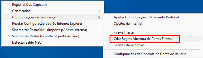 9) Selecione a opção Configurações de Segurança>Criar Regras de Abertura das Portas de Firewall