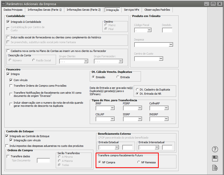 Em seguida acesse a aba Integração e defina o Campo Transfere Compra Recebimento Futuro, você deverá indicar se a transferência dos dados para o estoque será realizada pela nota fiscal de Compra ou pela nota fiscal de Remessa (Do recebimento das mercadorias). Com isso, mesmo que o Código Fiscal integre o estoque o sistema irá verificar mais esta consideração antes de exportar..