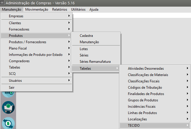Agora, você deverá cadastrar todos os tipos que a quebra definida poderá ter, para isso acesse o menu Manutenção>Produtos>Tabelas>TECIDO (O Sistema irá criar um menu com a quebra informada nos Parâmetros dos Produtos)