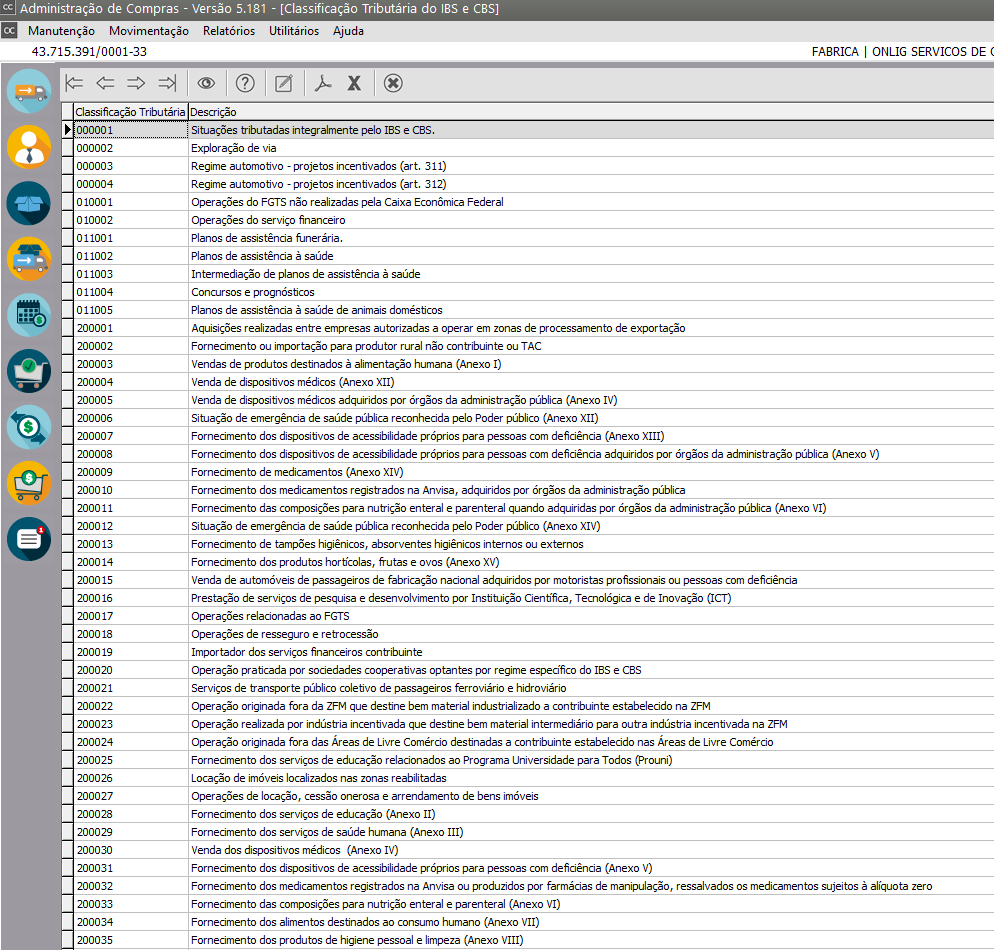 Será apresentada a tela contendo as Classificações Tributárias do IBS e CBS