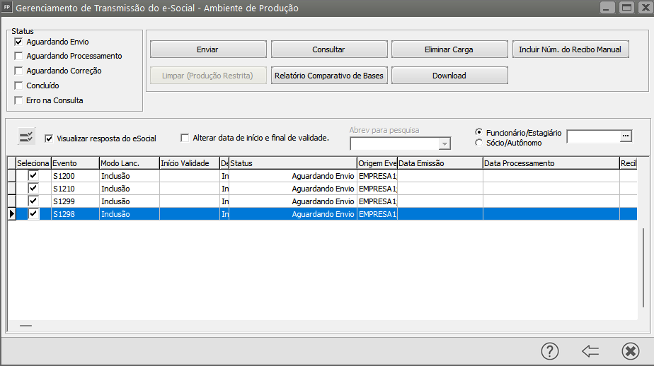 No momento em que você definir a Empresa serão criadas AUTOMATICAMENTE novas cargas que você deverá realizar o envio MANUALMENTE para o Portal do eSocial