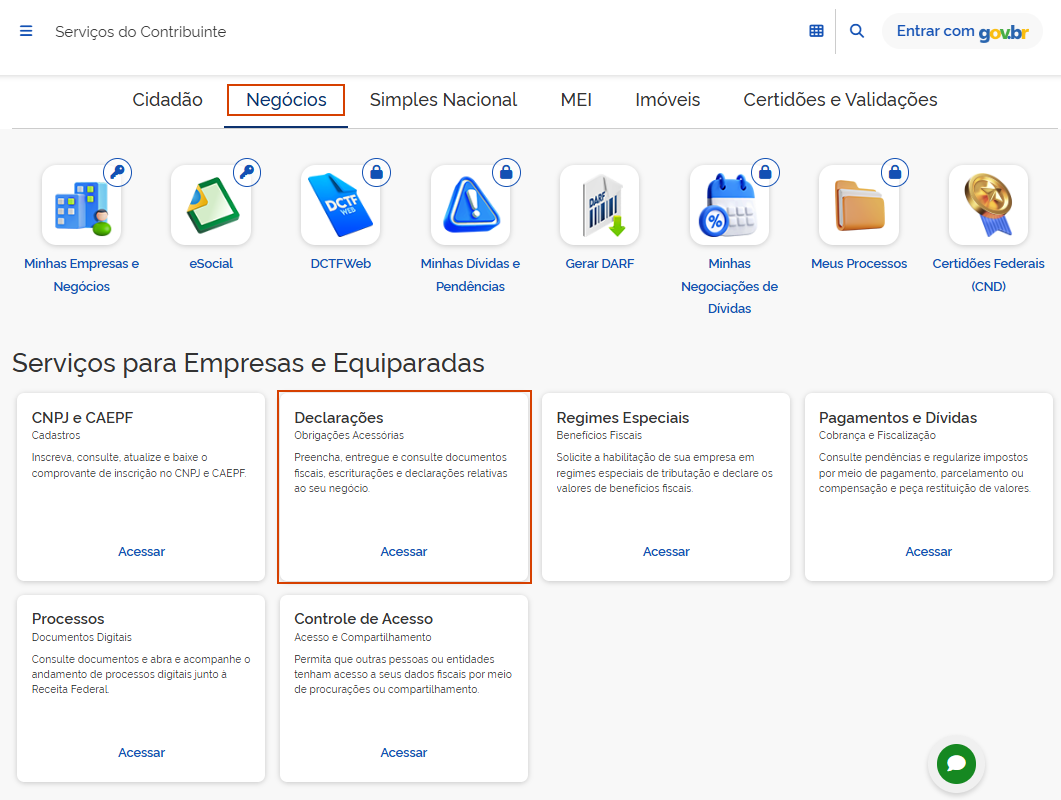 2. Em Negócios, clique em Declarações;