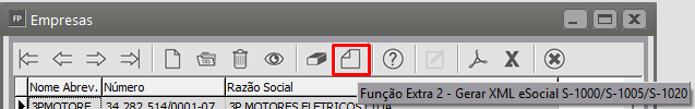 Clique na seta avança e em seguida clique na Empresa da geração da Carga, agora clique no botão Função Extra 2 - Gerar XML eSocial S1000, S1005, S1020