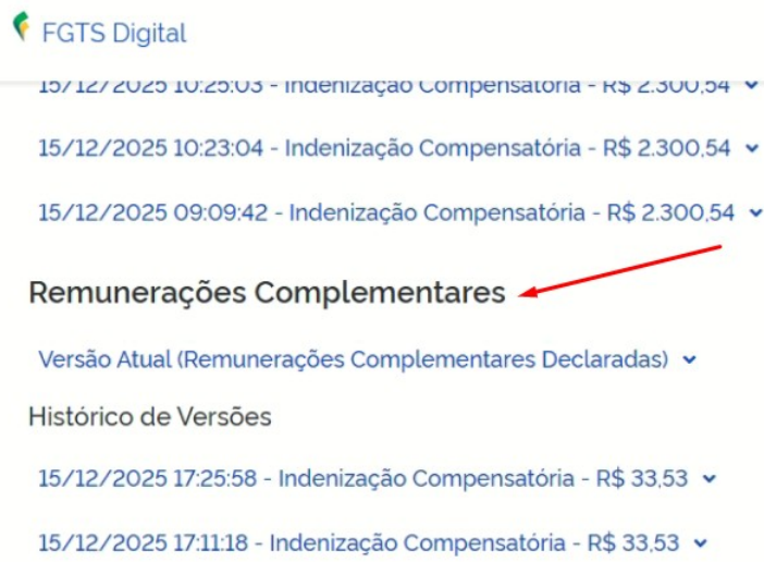 Para que você realize a conferência da informação, role a tela para baixo até localizar o campo "Remunerações Complementares" que está localizada logo abaixo do tópico "Versão Atual e Versões Anteriores"