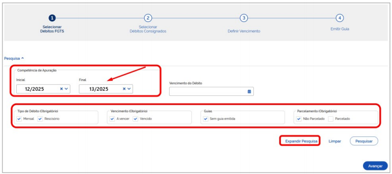 3) Para realizar a emissão da Guia de Recolhimento, além dos débitos habituais, será necessário selecionar também os débitos de FGTS do 13º Salário e de Indenização Compensatória Complementar, esta última referente a multa de 40% sobre o FGTS do 13º Salário.