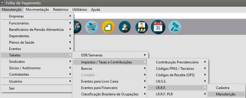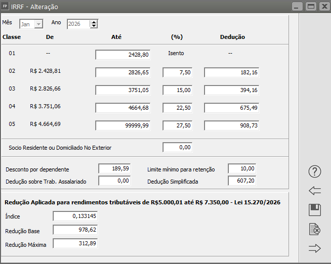 Para visualizar a nova Tabela de I.R.R.F. acesse o menu Manutenção>Tabelas>Impostos Taxas e Contribuições>I.R.R.F>Manutenção e pesquise por 01/2026