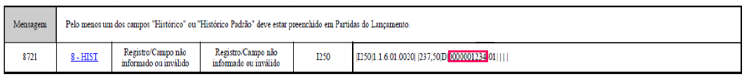 Registro I250 - Pelo menos um dos campos "Histórico Padrão" deve estar preenchido em Partidas do Lançamento