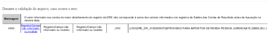 Registro J150 - Valor das contas detalhadas na DRE difere da soma dos saldos das contas de resultado antes da apuração, na mesma data