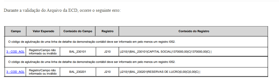 Registro J210 - O código de aglutinação de uma linha de detalhe da demonstração contábil deve ser informado em pelo menos um registro I052