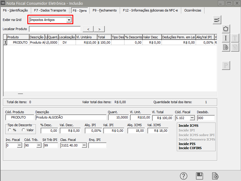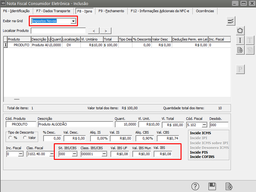 Os valores dos Impostos Novos serão apresentados se no campo Exibir na Grid você definir Impostos Novos