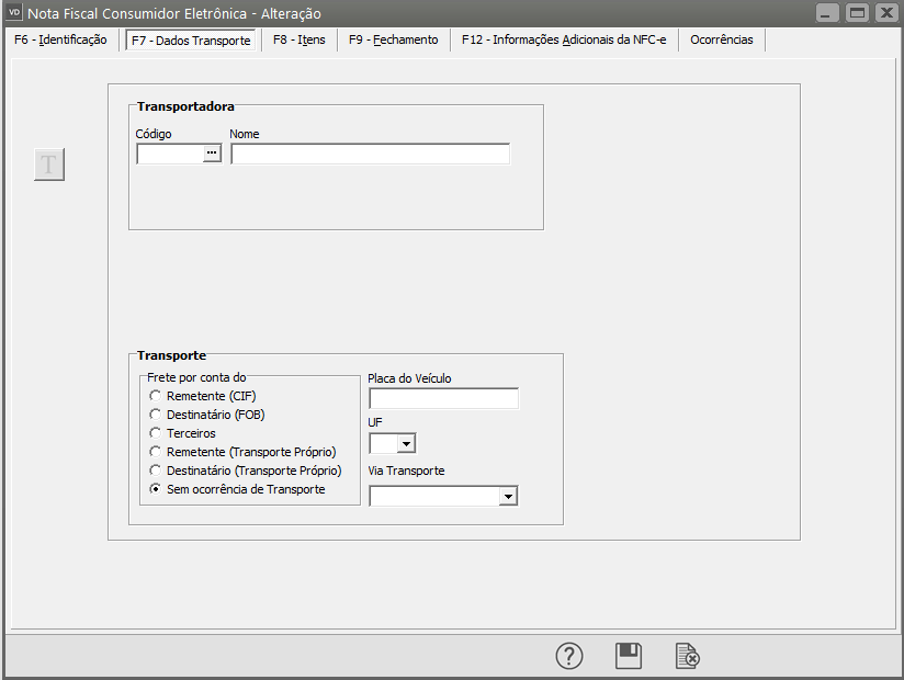 Observação: o campo “Transportadora” só ficará habilitado se em “Comprador Presente no Estabelecimento” estiver selecionado “Operação com entrega à domicílio”