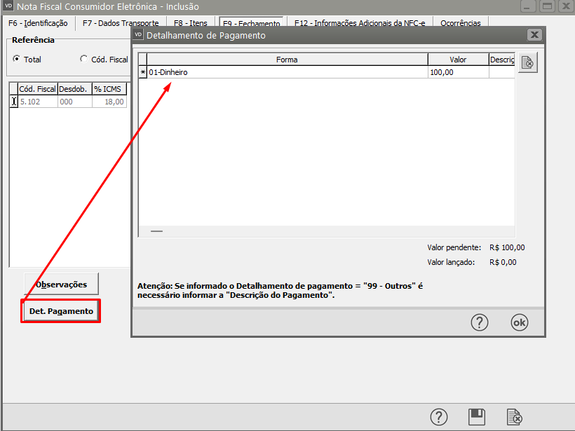 Em seguida acesse o botão Det.Pagamento, da Aba Fechamento