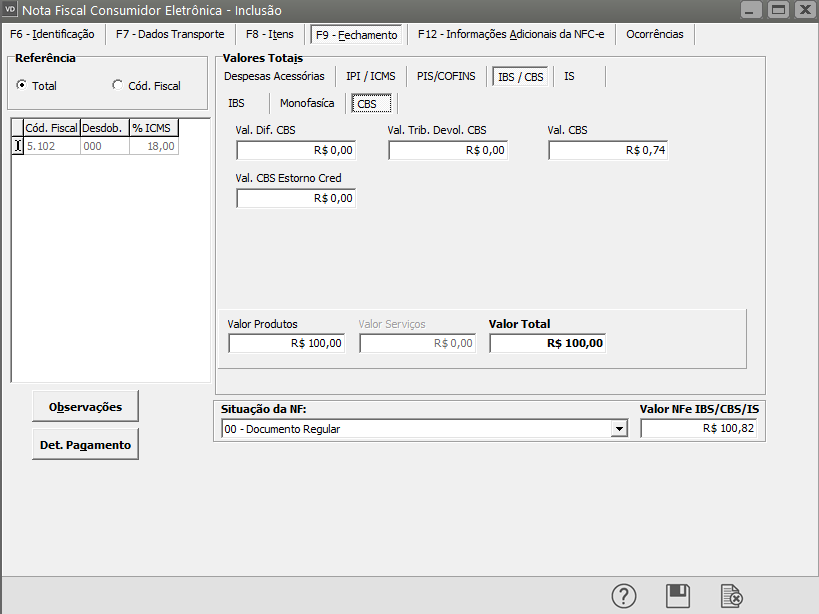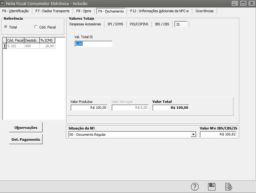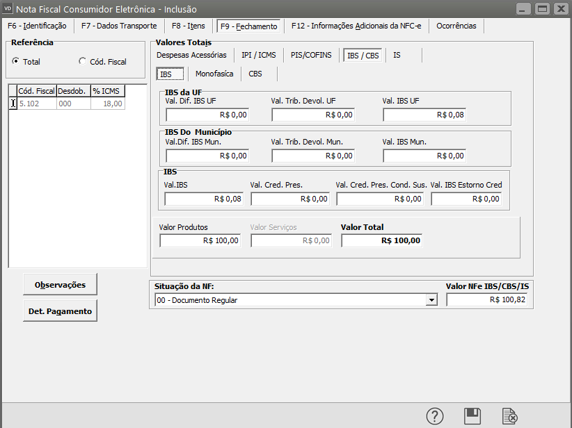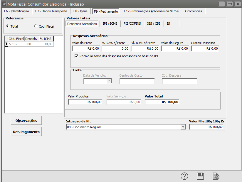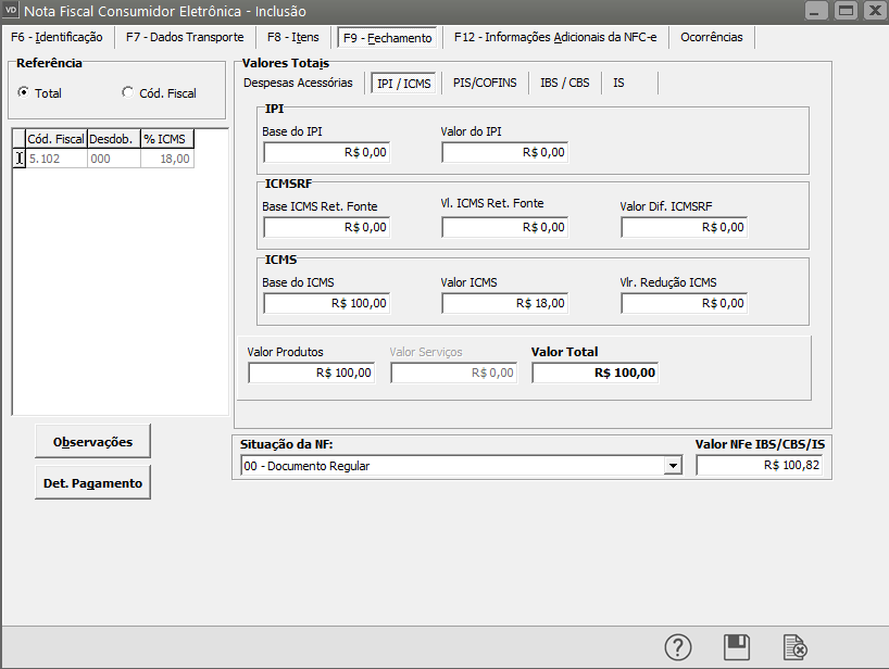Após o preenchimento correto da Aba Itens, verifique a totalização das informações na Aba Fechamento do Cadastro da Nota Fiscal do Consumidor Eletrônica