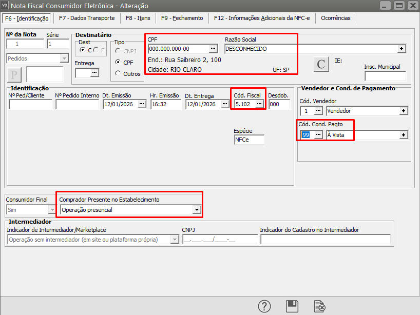 Se você preencheu as informações nos Parâmetros Adicionais da Empresa aba NFCe>Padrões os campos da aba Identificação serão praticamente preenchidas automaticamente e você poderá alterar se houver necessidade