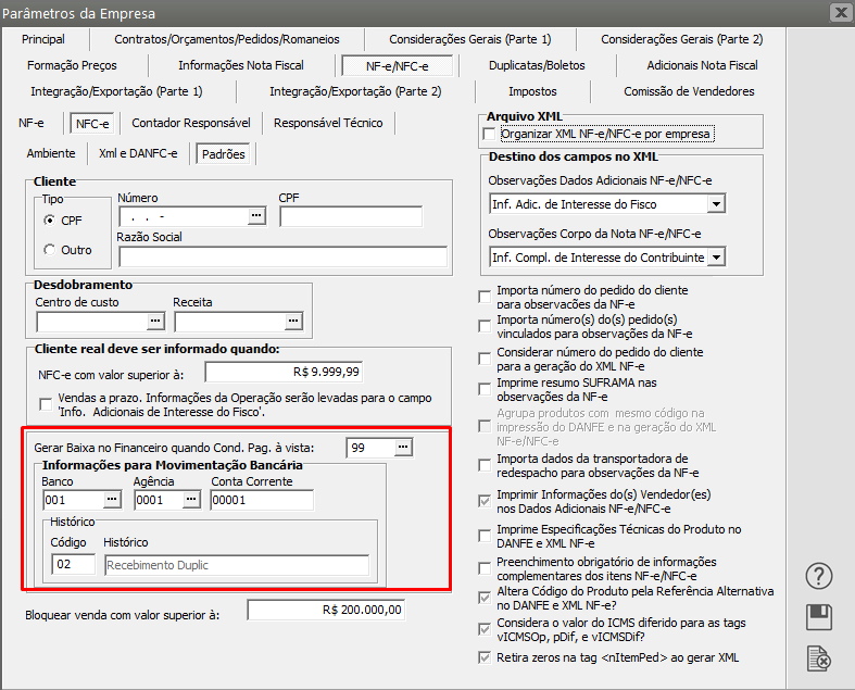 Na aba Padrões deverão ser definidas as informações que deverão ser respeitadas na Emissão da NFCe