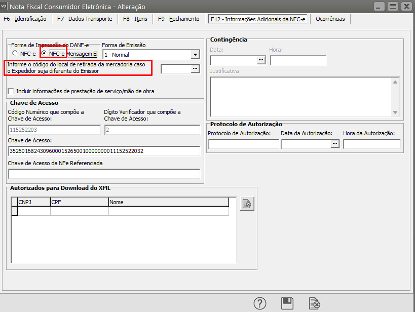Ao cadastrar uma Nota Fiscal do Consumidor Eletrônica a aba "Informações Adicionais da NFC-e" será habilitada, nessa tela deverá ser informado o código do endereço do depósito caso o endereço de retirada da mercadoria seja diferente do endereço da empresa.